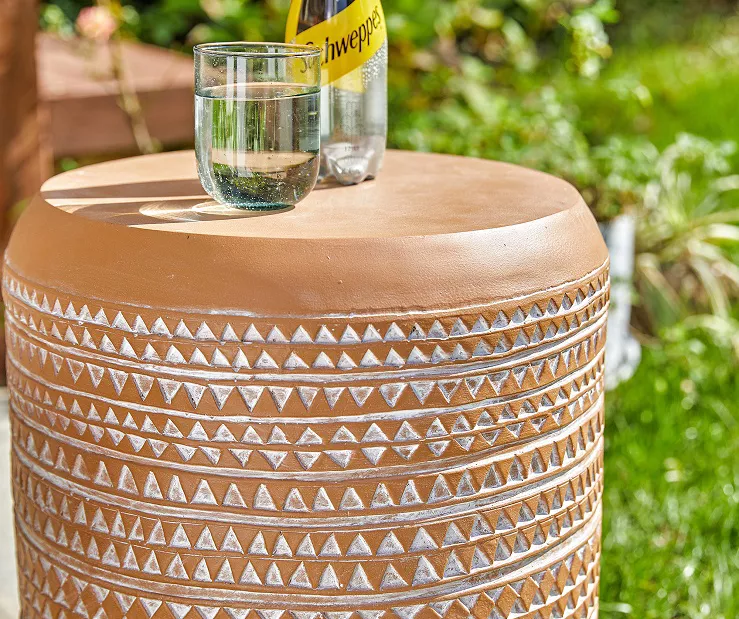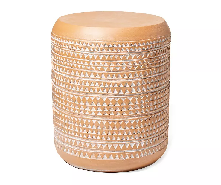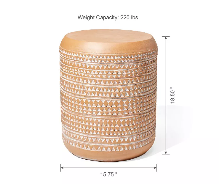 Enhance the look of your outdoor space with this stunning drum garden table. A unique imitation terracotta design features a carved triangle pattern around the sides in an antique white look. Use it to showcase planted greenery in the garden or keep it chairside on the patio as an accent table.