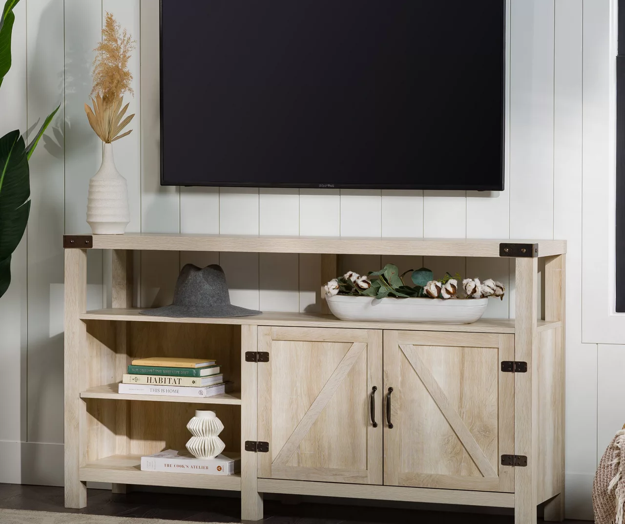 Versatile and beautiful, this highboy console will easily give any room in your home extra storage and flair. With a barn door style cabinet for concealed storage and spacious shelves to display your electronics or games, its asymmetrical design will complement your aesthetic while helping you organize your home in a way that feels just right. Woodgrain detailing featured on a durable laminate top, this TV stand is constructed with warp-resistant MDF. The modern farmhouse style of this entertainment center will give a rustic and charming accent to your living room while keeping your media and room essentials organized and neat.