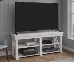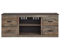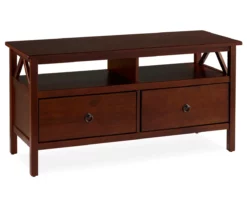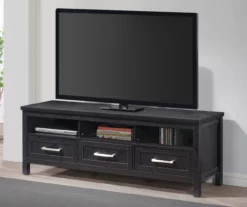 Store and entertain with this TV stand from Real Living. The classic design in a black finish features open compartments for all your media equipment needs as the cabinets and drawer stores away accessories, DVDs and more. It’s a casual addition to a living space, den or basement.