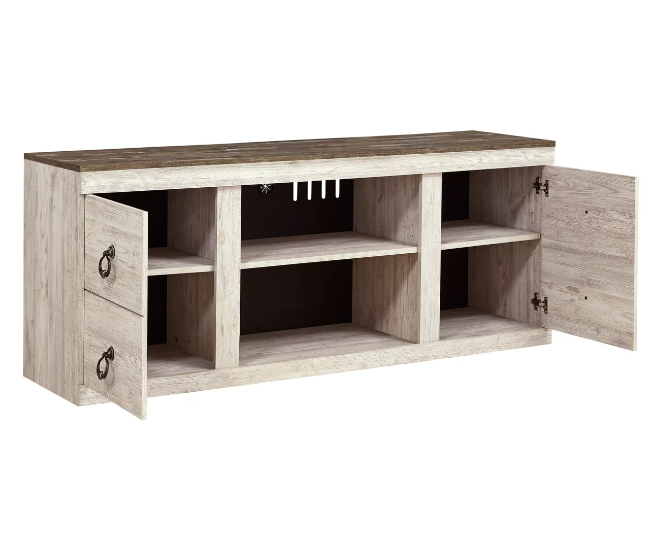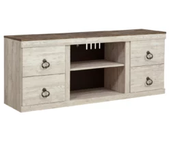 This TV stand is the ultimate statement piece for your coastal cottage or shabby chic inspired retreat. Its whitewash finish is wonderfully easy on the eyes. Paired with the unique plank-style top, it’s a driftwood-inspired look that will have your mind drifting away to beachy-keen escapes.