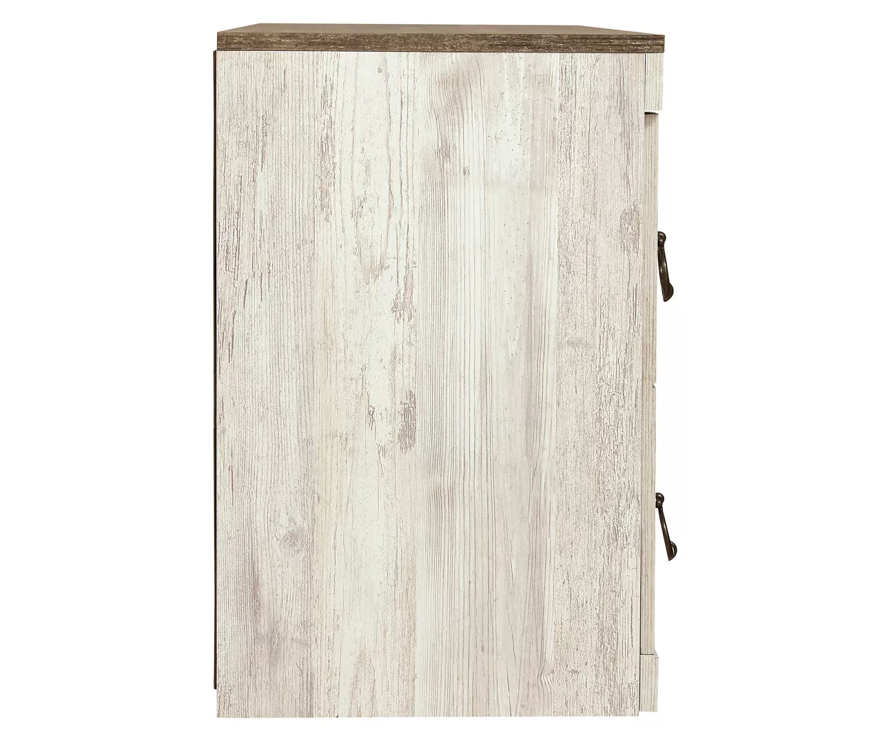 - Ring pull hardware in an antiqued brass-tone finish