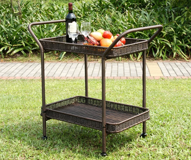 Cater to your guests and loved ones in style using this rolling cart. Constructed with a powder-coated steel frame, its wrapped in handwoven all-weather wicker in a white hue. Complete with dual handles and four wheels for maneuverability, the two shelves allow you to serve drinks and snacks on your patio or deck.