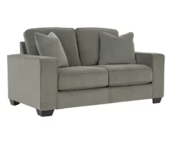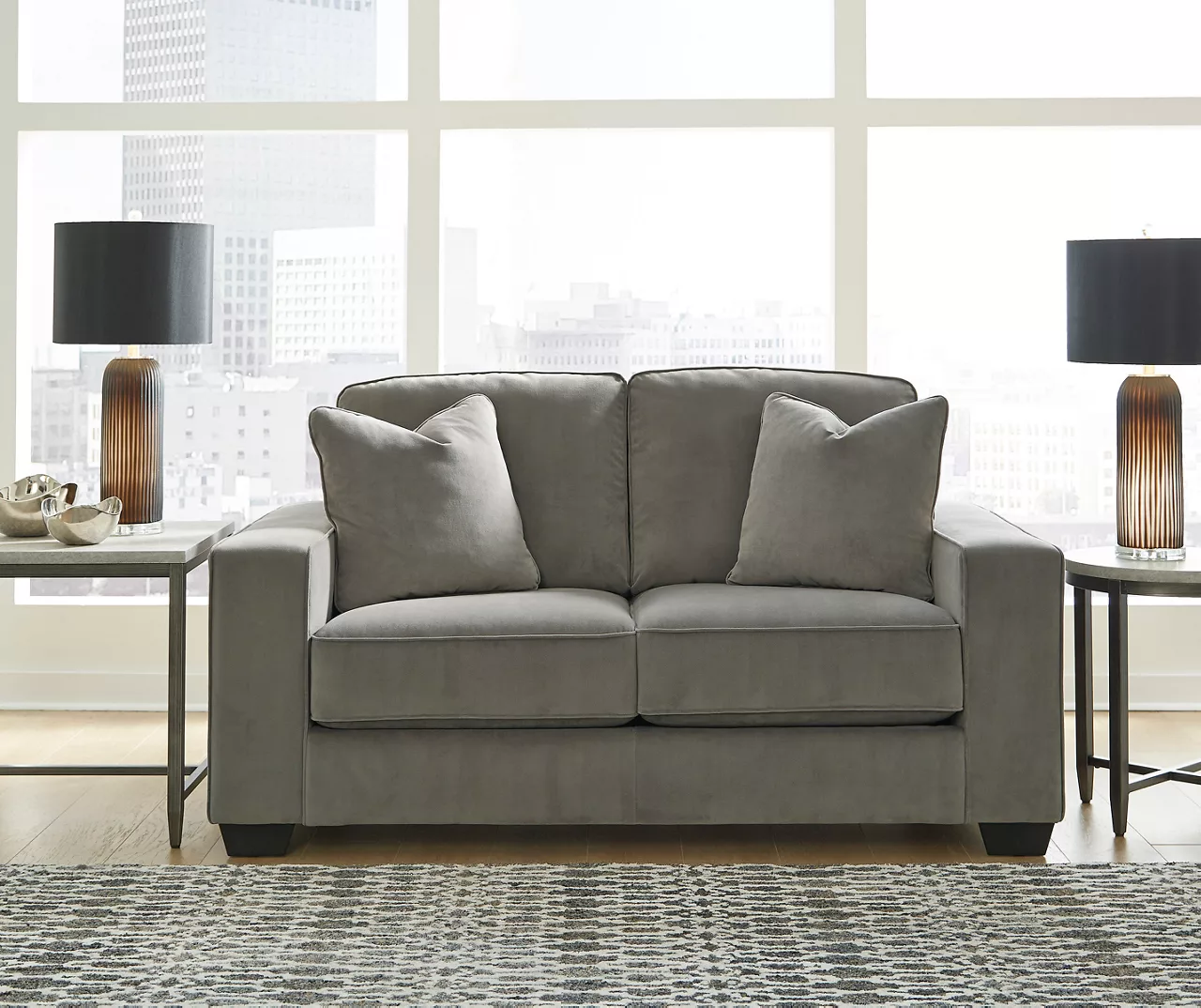 Serving up a refined, upscale look at an incomparable value price, this loveseat lures from every angle. Crisp, two-over-two cushion design, wide track arms and black tapered feet lend a clean, contemporary aesthetic. Velvety soft upholstery in a chic sandstone gray upholstery takes neutral to another level. Matching feather-filled throw pillows master the art of minimalism.
