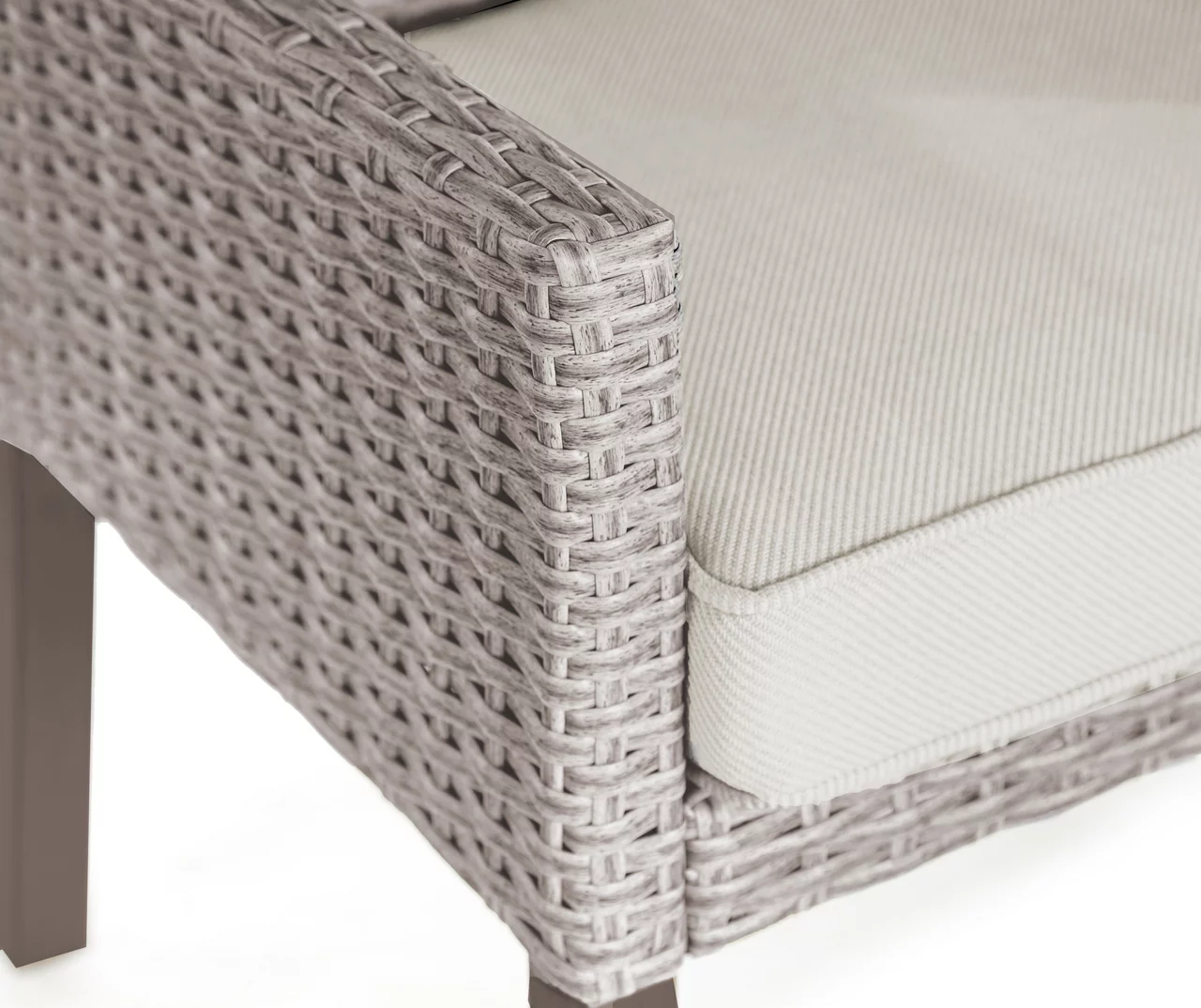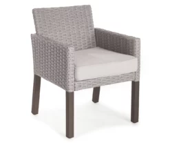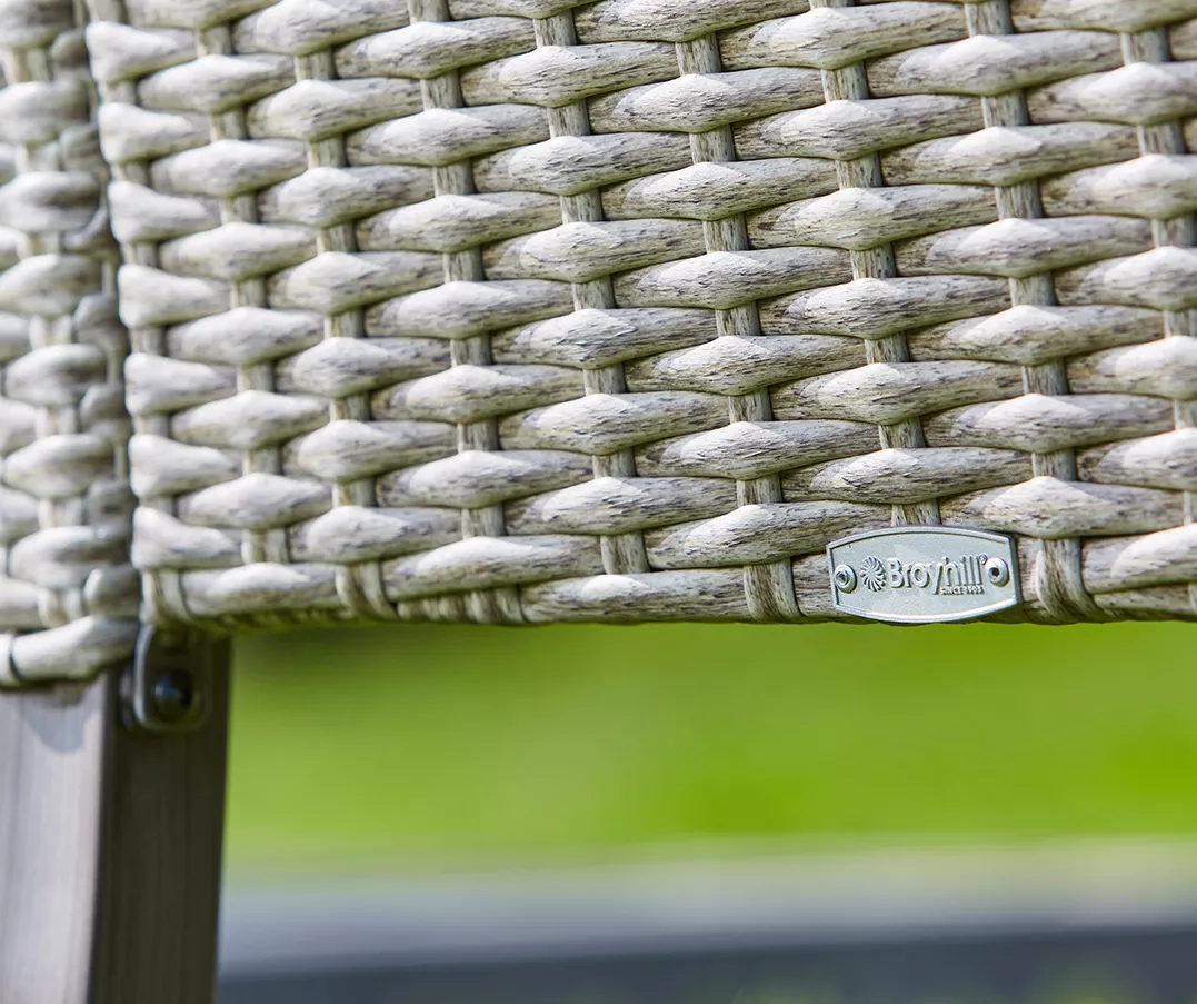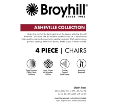 Take a seat outdoors and dine in the comfort of these Asheville dining chairs from Broyhill. Each chair features a weather resistant, hand painted steel frame accented with handwoven all-weather wicker. Elevated with fade-resistant Olefin fabric cushions and side armrests, this set of four chairs is a fantastic addition to your outdoor enjoyment on the patio or deck.