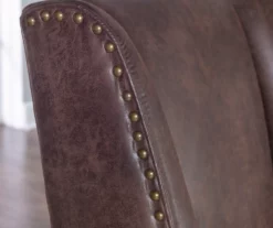 Add style and function to your office with this office Chair. The soft, plush frame is upholstered in a brown PU fabric and features a square back. Burnished brass nailheads accent the chair. A dark walnut wood base has metal casters for ease of mobility. Perfect for a home work space or the office.