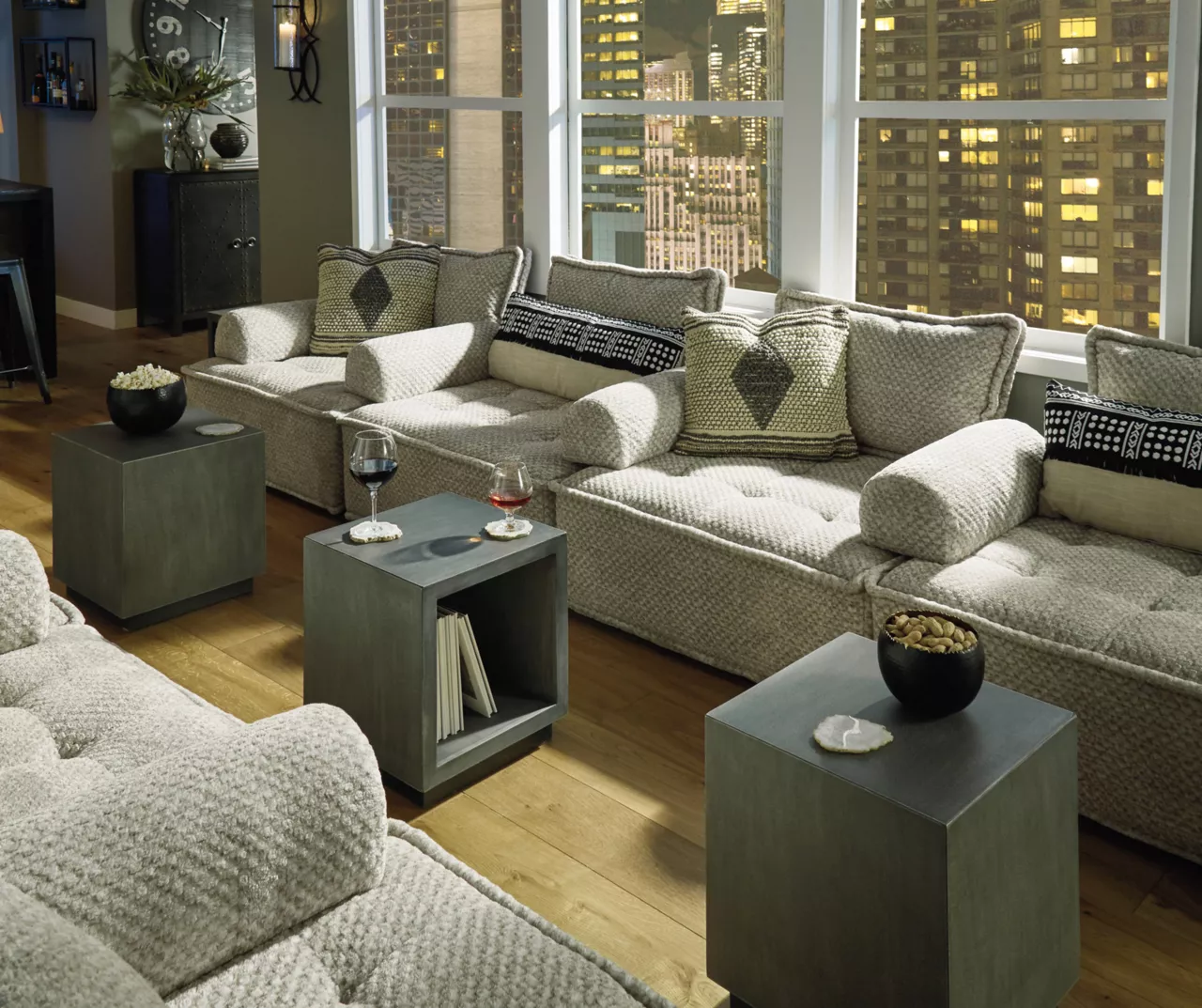 Be bold with a modern take on seating. Modular and armless, the Bales accent chair carries a checkered taupe upholstery neutral enough to fit in any style while elevating it at the same time.