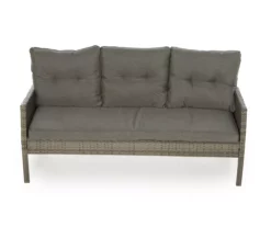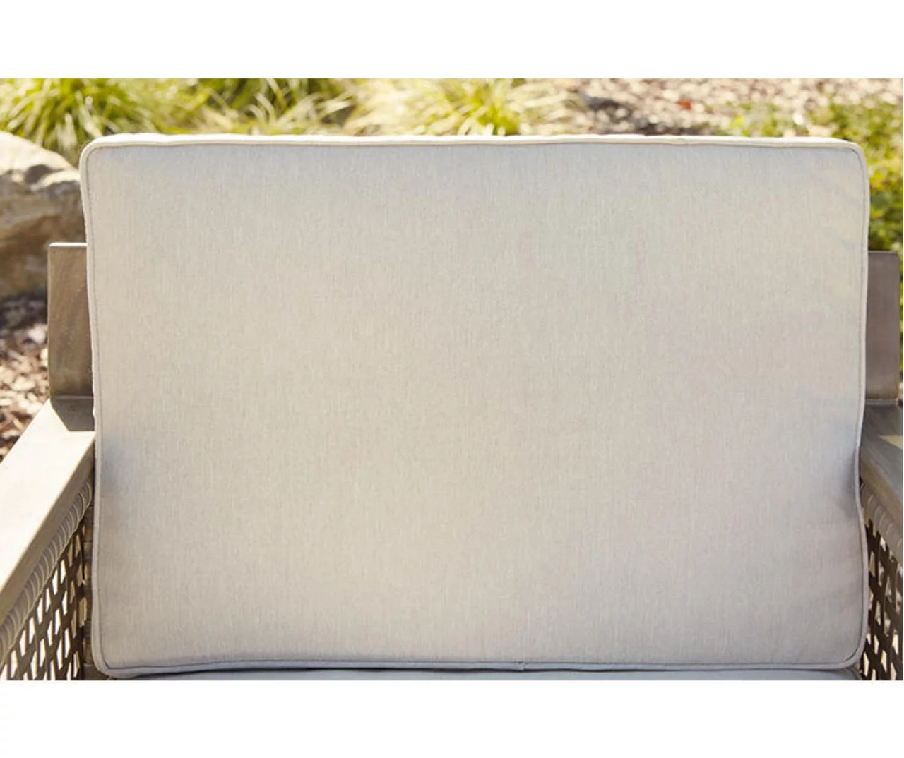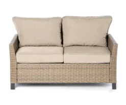 You’ve got it made in the shade with this outdoor loveseat with cushion. Made with eucalyptus wood, the loveseat features a wicker seat, back and sides. Tan cushions are wrapped in easy-clean Nuvella® fabric, which stands up to harsh weather for season after season of enjoyment. Two floral throw pillows add a splash of color.