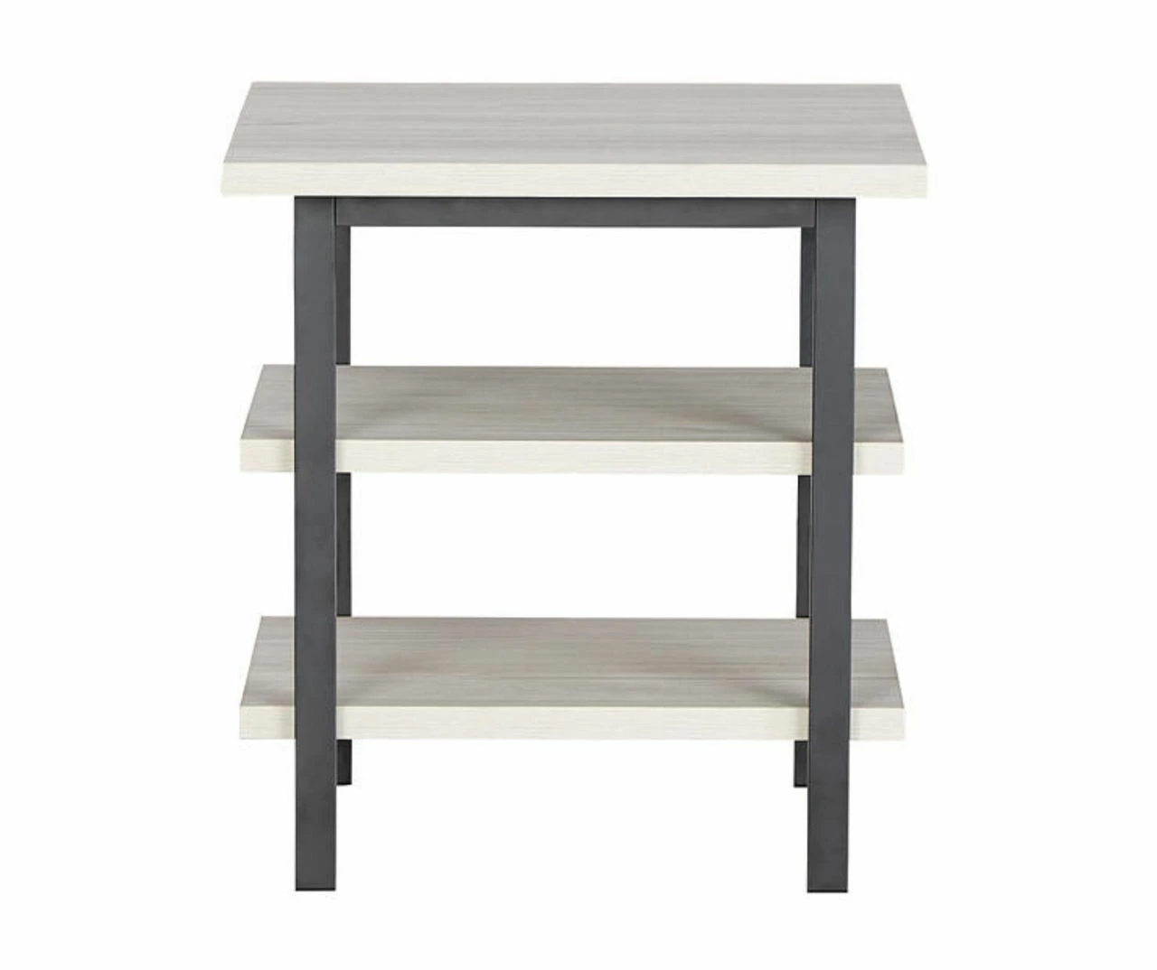 Entertain with ease with this casual, contemporary end table set. Designed for the modern tastemaker, the minimalist design wows with metal legs and a laminated surface with a whitewashed effect. Two display shelves provide ample space for books and baskets, or for showcasing your special decor accessories.