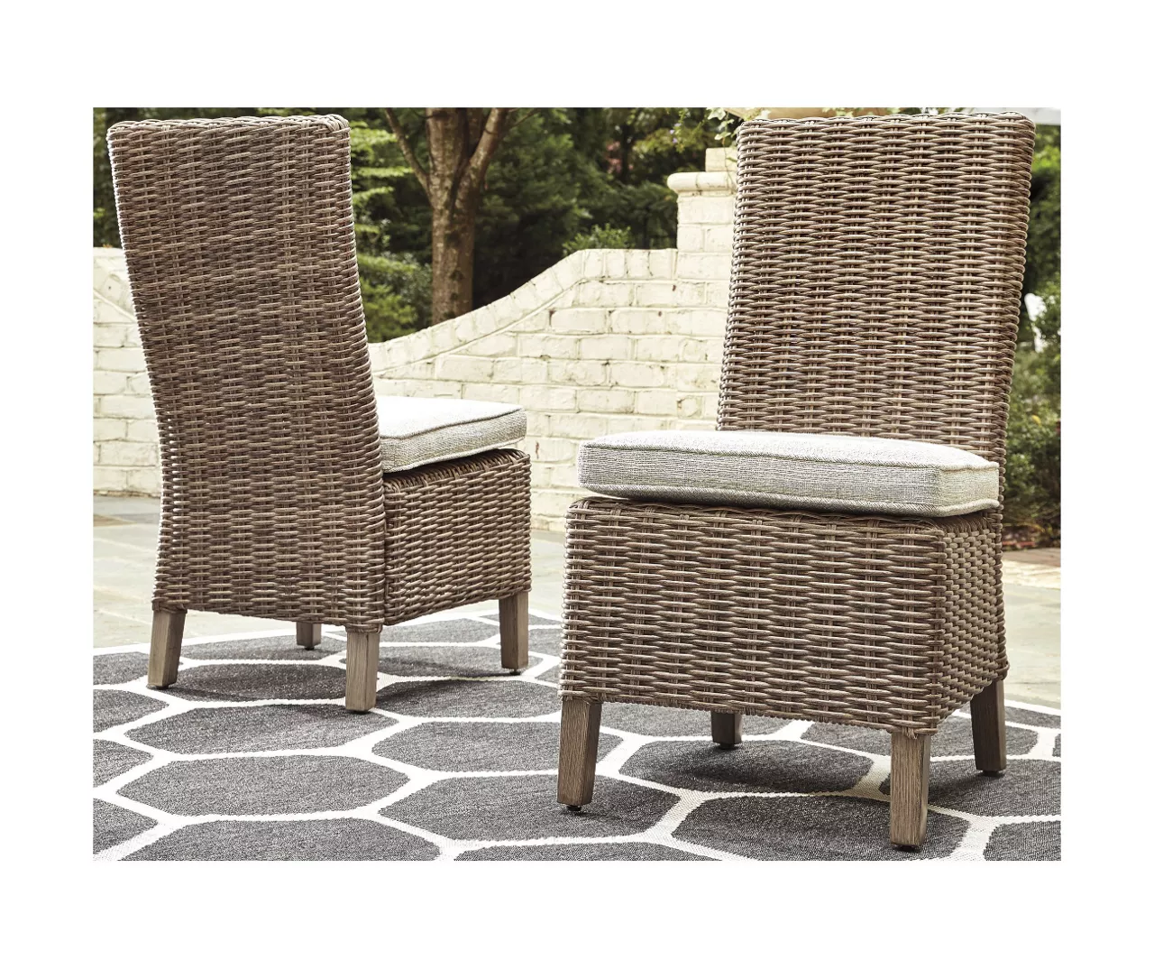 - Includes 2 outdoor dining chairs with seat cushions