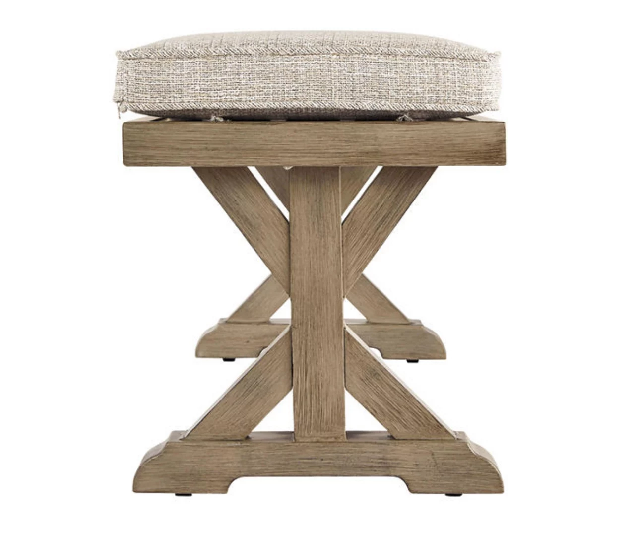 Sporting an easy-on-the-eyes look inspired by driftwood, this bench with cushion elevates the art of indoor-outdoor living. Beautiful and durable enough for indoor and outdoor use, this casually cool bench entices with striking X-leg farmhouse styling and a plush, removable cushion wrapped in high-performing Nuvella fabric that’s a breeze to keep clean.