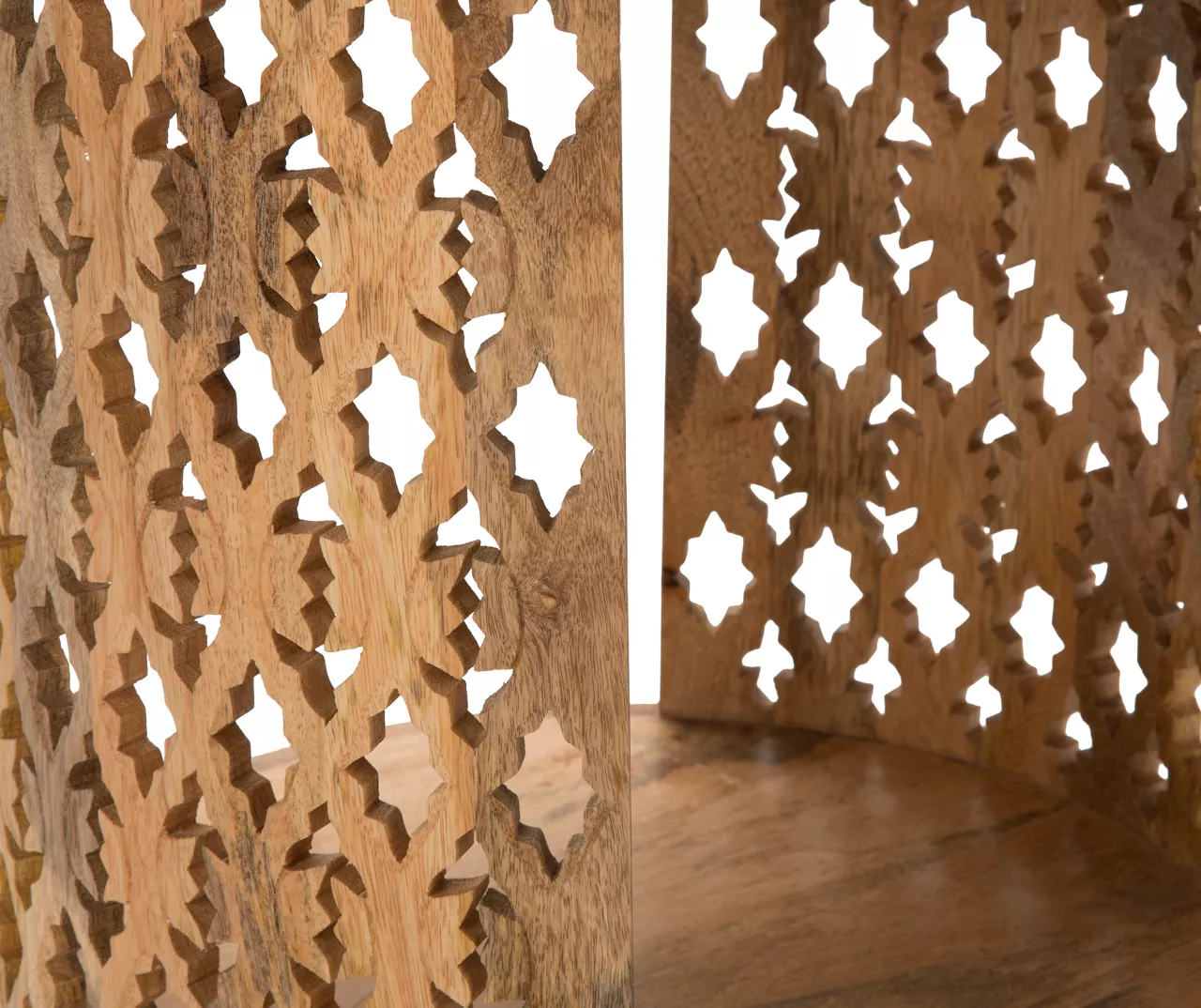 - Solid mango wood construction features hand-carved rosette patterns along the sides