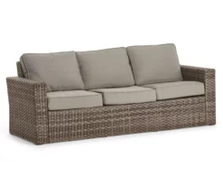A classic pairing of fabrics and handwoven wicker by artisans create this high-end, yet inviting Broyhill Eagle Brooke sofa. Complete with oversized deep-seating tan cushions that bring long lasting beauty and comfort to your outdoor living space, this sofa inspired by coastal living will transform any patio into a welcome retreat from daily life. Offering ample space for relaxing comfortably with your guests, this sofa invites you to step outside and enjoy outdoor living at its finest.
