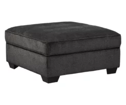 Wrapped in a decadently plush charcoal upholstery, this oversized ottoman makes the most of its generous scale. Underneath the removable cushioned top: a handy, dandy storage compartment that’s perfect for last-minute cleanups.