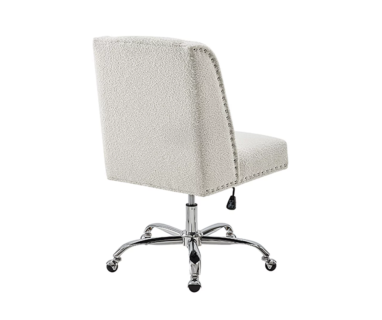 Add style and function to your office or dining with this office chair. The soft, plush frame features simple, modern lines upholstered in an oh-so comfy natural Sherpa material with silver nail heads. A sturdy silver chrome base is set upon durable metal casters for easy maneuverability, while an adjustable seat height ensures this chair works for a variety of table heights. Perfect for a home workspace or a formal dining area, it is sure to add style and comfortable seating.