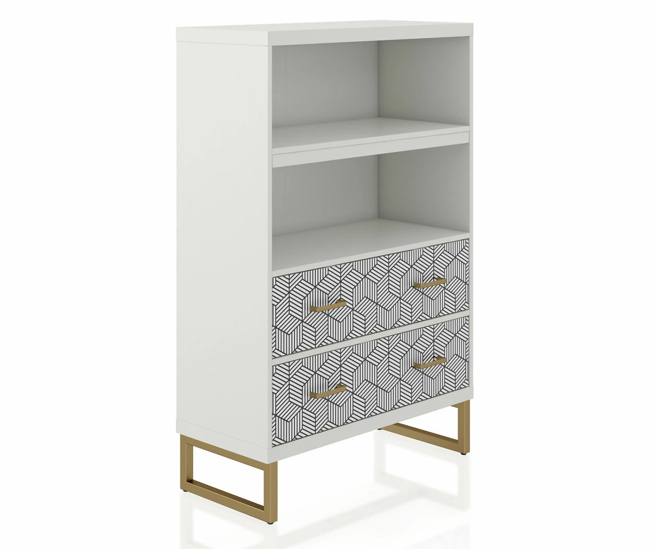 - Modern silhouette with 2 open shelves and 2 patterned drawers for knick-knacks and books