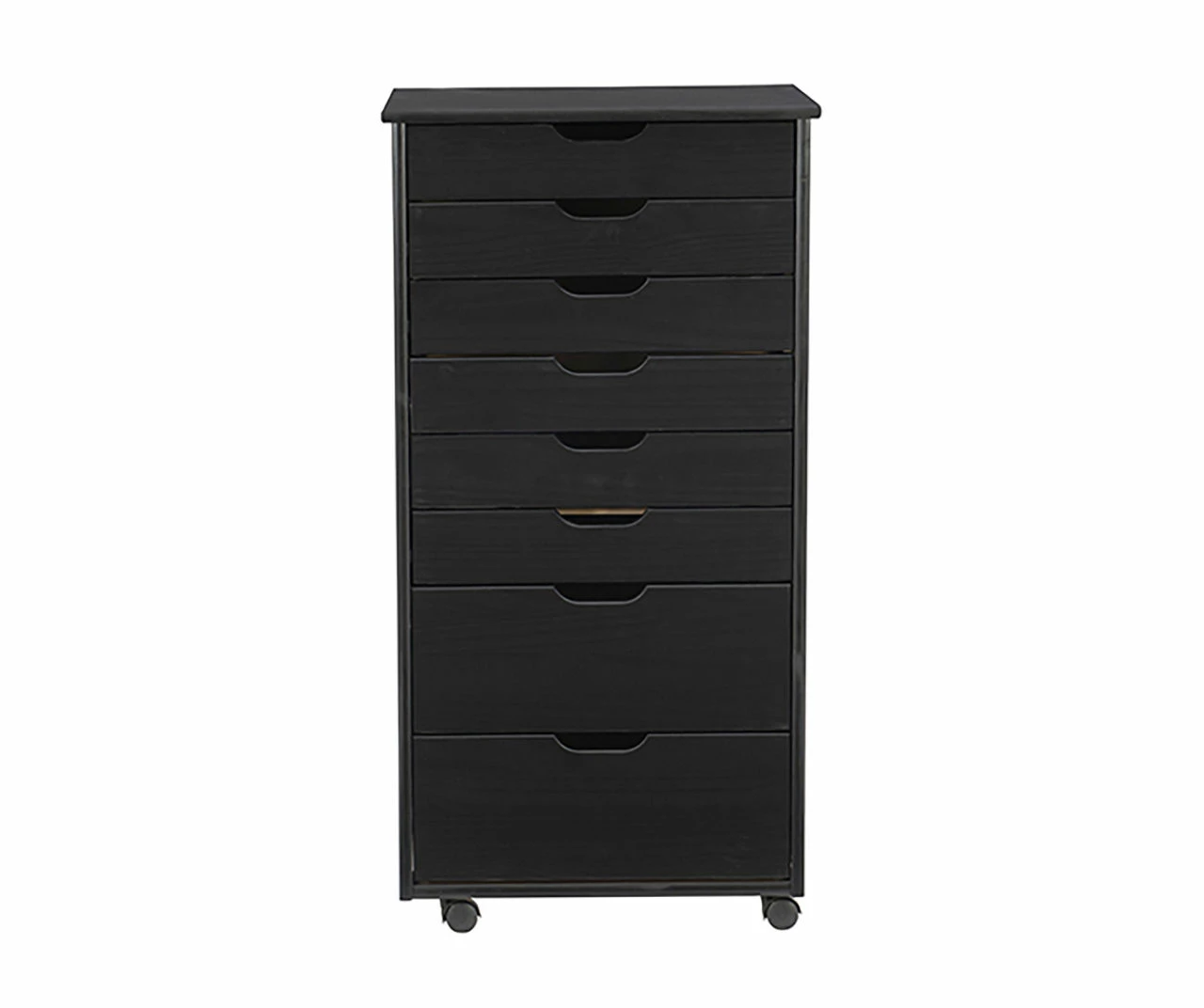 This eight-drawer rolling storage cart is a versatile storage solution for your office, kitchen, bedroom or anywhere where organization is needed. Solidly constructed from pine wood and finished in a handsome black, the six equal size and two deep drawers are finished with an ample top that can go next to a desk or craft table to put items within reach. Soft contoured handle cut outs are easy on the touch and create a clean, modern look. Drawers can be easily removed and used as a tray to transport your items to your workspace, while casters make this piece mobile to go into any room easily.