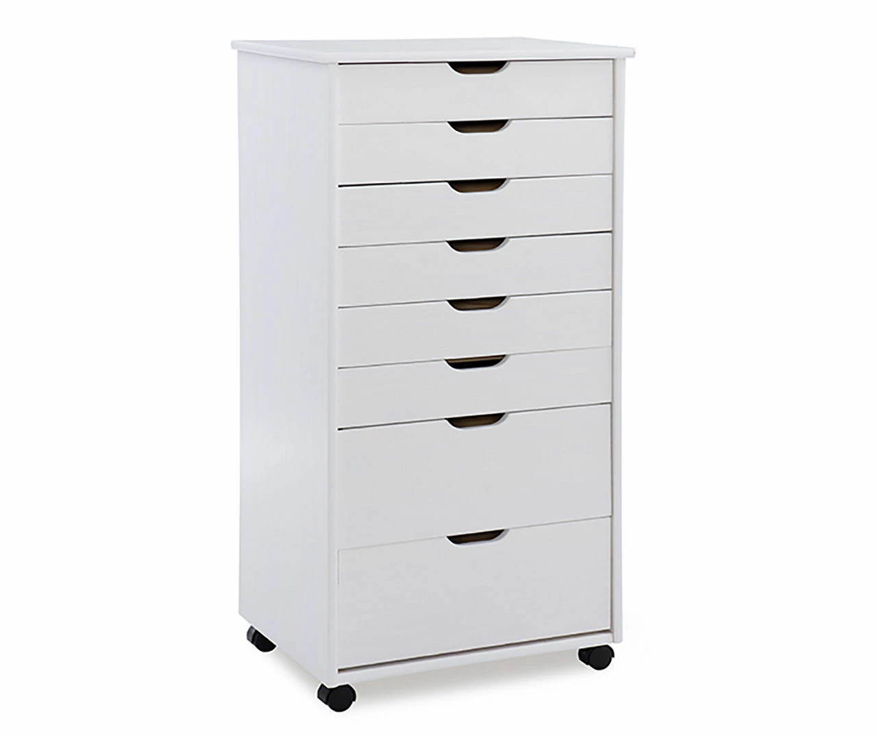 Blending versatility with simple, classic lines, this storage cart makes organizing any busy home or office a breeze. Six equally sized drawers and two larger drawers offer ample space for craft supplies, toys or accessories while wheeled casters ensure easy mobility around the space. The white wash finish brings warmth and visual interest to the piece. Drawers are removable for added convenience.