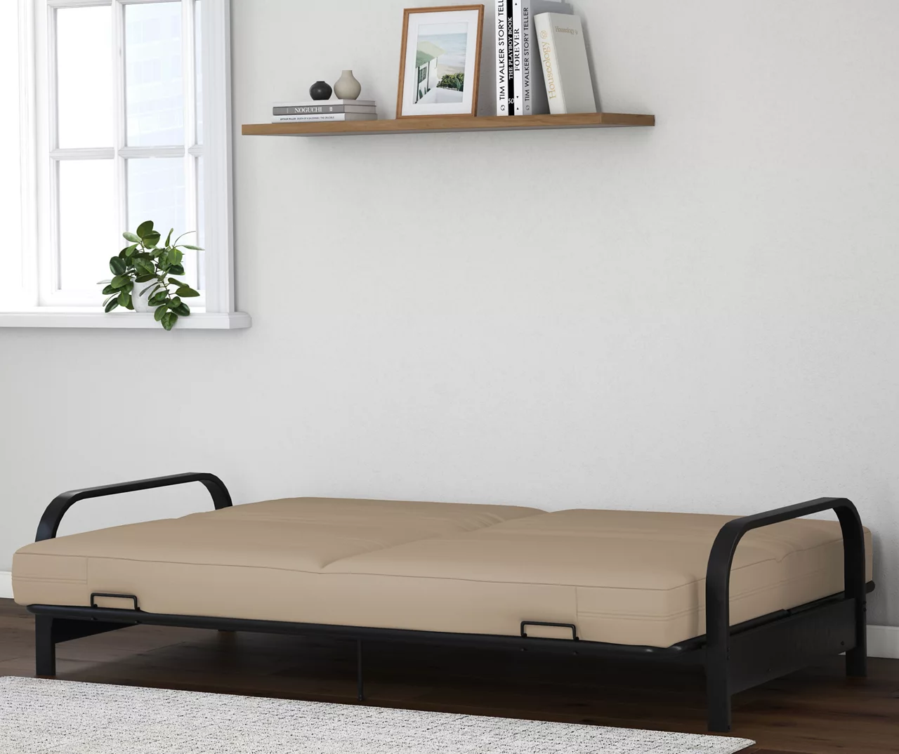 Contemporary and clean, you can never go wrong with the DHP Elbern futon. Whether you’re looking for the perfect furniture piece to decorate your small space living room, guest room, den or home office area, the Elbern takes space-saving style to the max by letting you simply lower the backrest to turn it from a couch into a practical guest bed. Displaying stylish curved slopes on the arms of the sturdily built metal frame, its strong construction includes two front retainer clips that prevent your futon mattress from sliding off while center legs add sitting, lounging, and sleeping stability. The included pocketed linen fabric slipcover fits the provided futon mattress pads to a tee and feels soft to the touch. And speaking of the 6-inch futon mattress, its clever composition delivers firm comfortable support and has also passed a 1000-cycle resiliency test with flying colors, meaning that it’s less likely to bottom out after extended use.