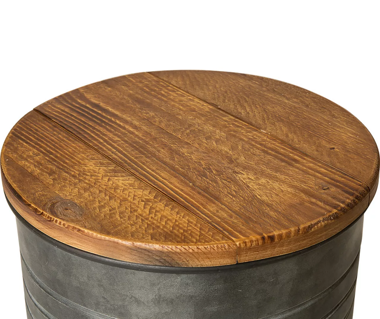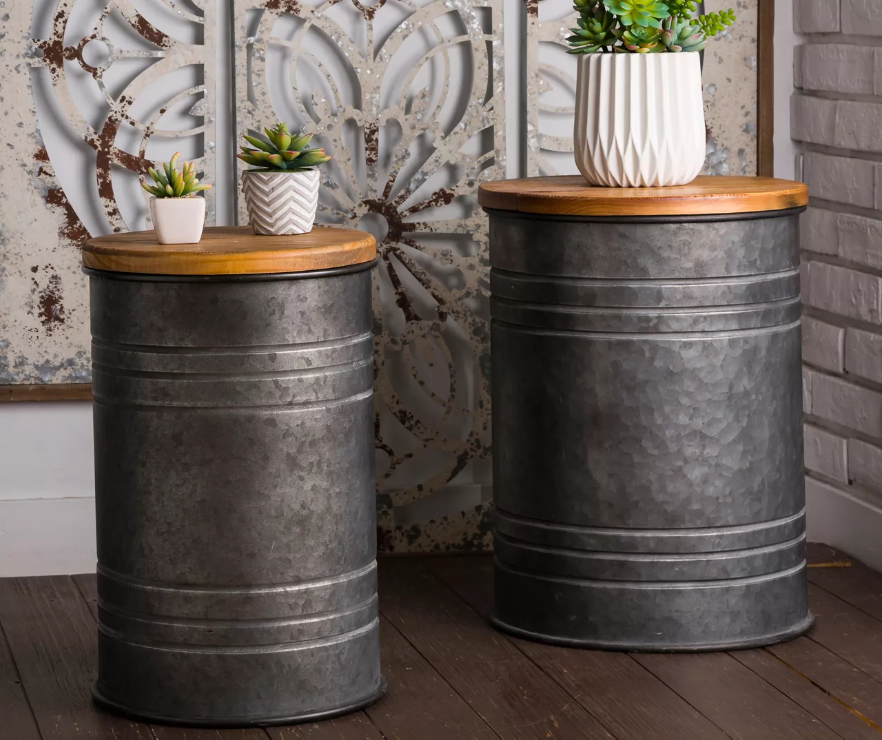 These inspired stools add rustic country charm anywhere you choose to put them. Each removable top is made of wood while the galvanized metal bases feature a powder finish. Providing form and function with interior storage capabilities, this set of two will look great displaying decorations, potted plants or accessories.