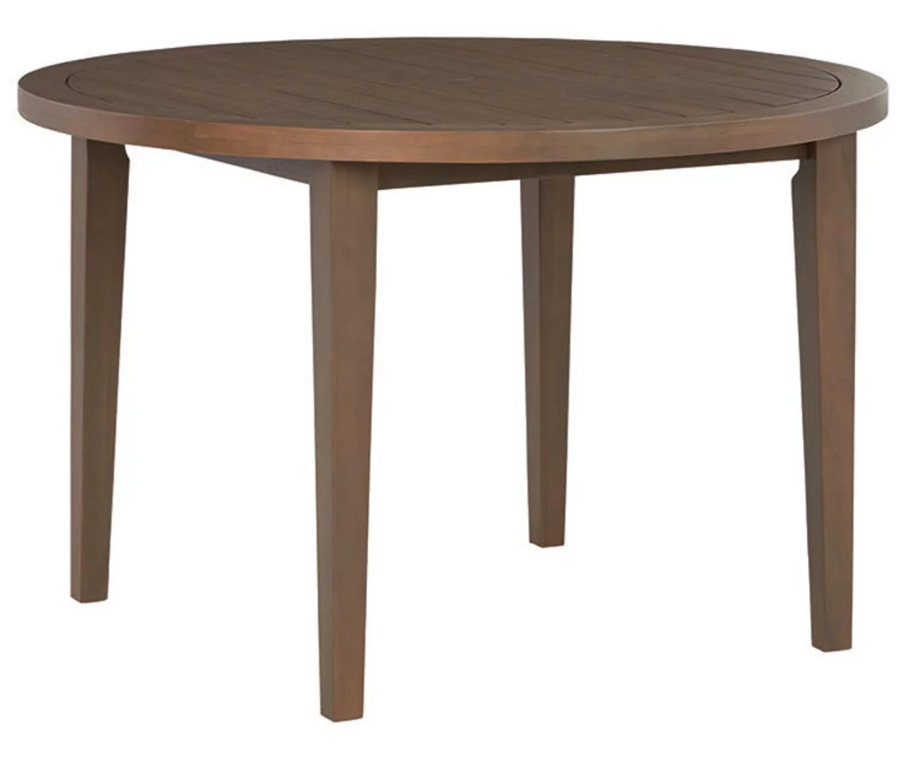 Round out your indoor or outdoor living space with the naturally beautiful look of wood in this round dining table. Crafted with eucalyptus, this durable wood table will serve up seasons of worry-free dining in your sunroom, on your deck or sitting pretty poolside. The option of adding an umbrella lets you throw some shade in your outdoor living space.