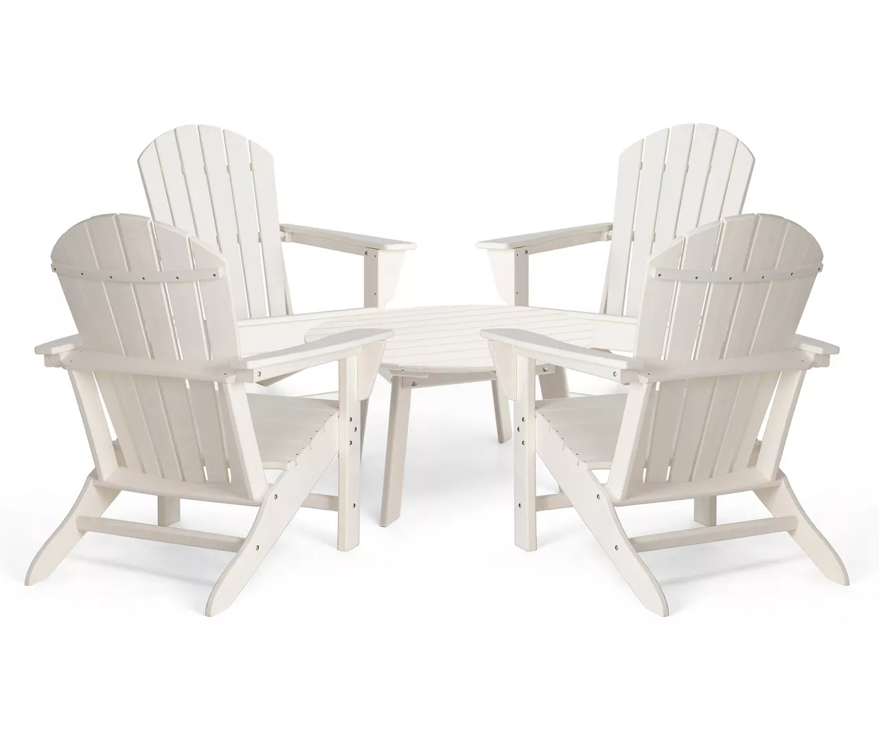 This five-piece seating set lets you enjoy casual conversations and happy hours with friends and family outdoors. It includes four Adirondack chairs and a coffee table, all constructed of durable and all weather-resistant high density polyethylene that is very easy to clean and needs almost no maintenance. Slanted seats and full backs hug you in comfort as extra-wide paddle armrests are ready to hold a drink. This set is the perfect addition to your patio, poolside, garden, backyard or any other outdoor space!