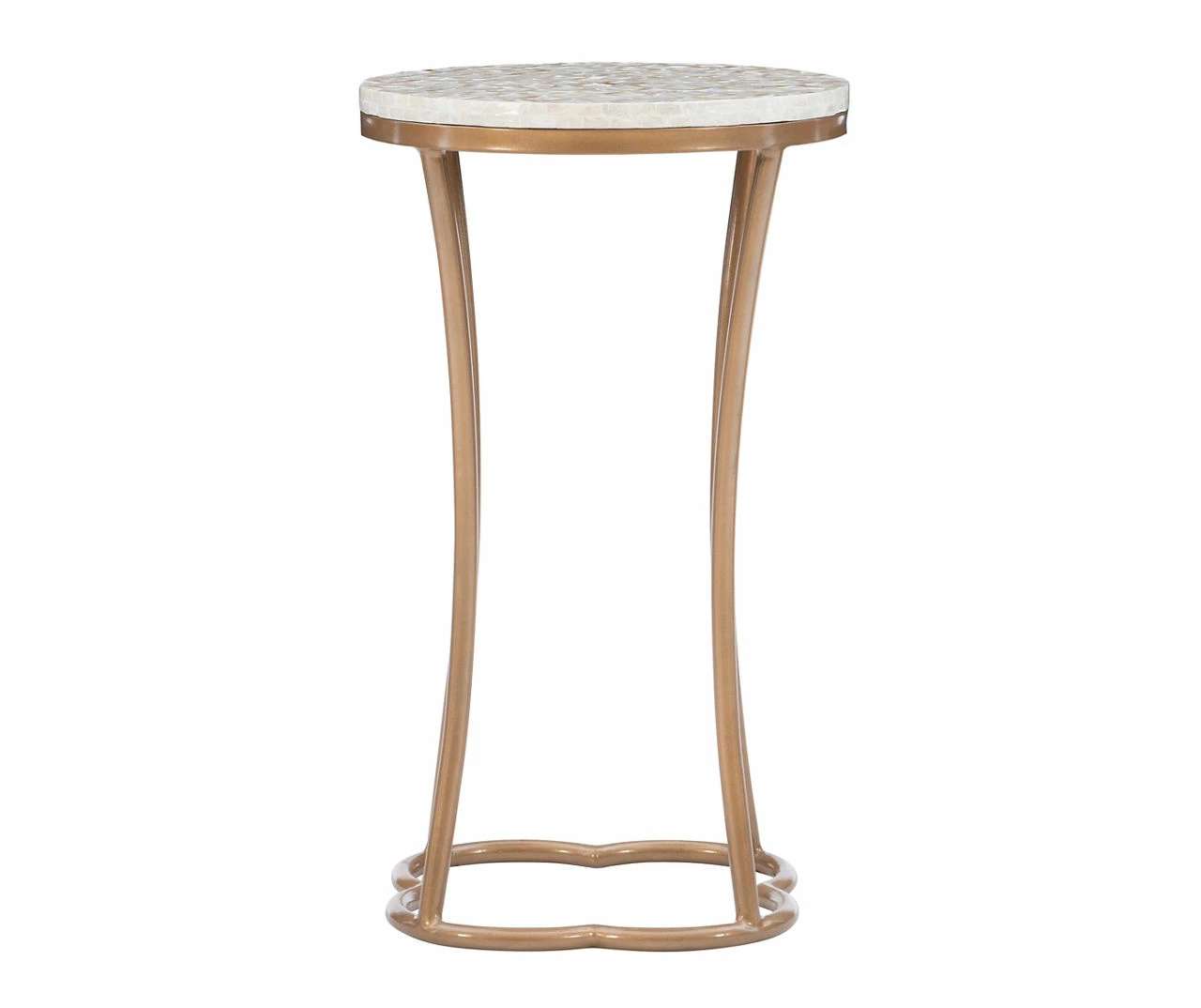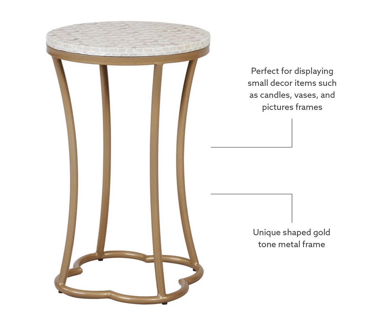 This modern accent table blends subtle shapes and curves with a coastal flare. Adds a splash of accent in event the smallest of spaces. Featuring a gold bent tube frame and neutral capiz shell finish on the table top, this unique piece will serve as a beautiful accent in nearly any decor. This round table is perfect for displaying small decor items such as candles, vases and pictures frames.