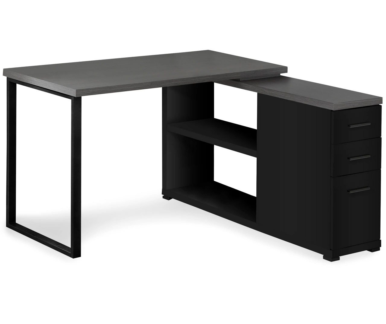 Versatile, contemporary and packed with storage compartments, this stunning L-shaped desk can be assembled on the left or right side, making it uniquely yours to customize. Designed with clean lines, thick panel construction and low track metal legs, it truly is the ultimate combination of form and function. The side surface offers an additional work space and is supported by an attached three-drawer console, including one file drawer. The black metal handles add to the desk’s sleek design appeal.