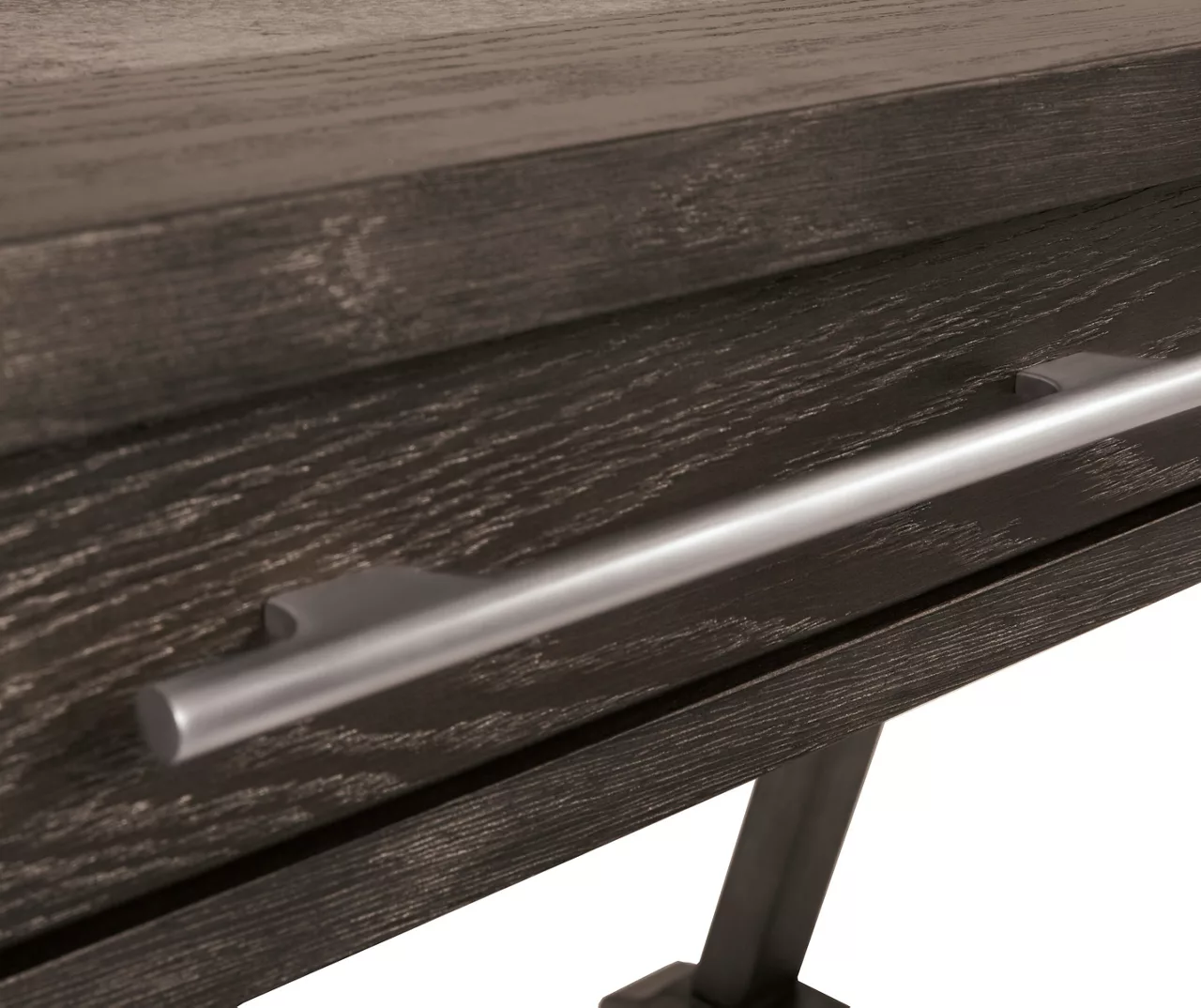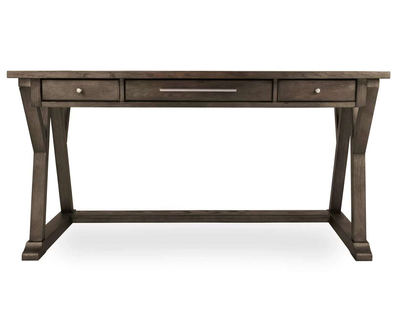 Work the latest trend in casual farmhouse living with this home office desk. Elements include distinctive cross brace with stretcher styling and a wire brushed gray-brown finish that’s so easy on the eyes. And, making this home office desk all the more unique is its faux bluestone inset on the desk top for a mixed media twist. Three smooth-gliding drawers with brushed nickel-tone pulls help keep you organized and on task.