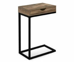Tired of holding a beverage in your hand and a bowl of popcorn in your lap while binge watching? This accent table keeps them within easy reach so you can sit back and enjoy the show. The C-shaped base slides under your sofa or chair, placing the table surface close to you. For added convenience, the top includes a storage drawer that is accessible from both sides. Use it to hide away mobile devices to avoid interruptions while you’re watching TV, then store remotes in it when you’re done. Stylish and versatile, this portable accent table features a top in a brown reclaimed wood finish and a metal frame in black that adds a modern look wherever you need a small side table with storage.