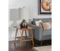 Introduce the robust look of mid-century modern style into your home with this handsome side table. Dynamic yet timeless, this piece features a linear design including a slatted bottom shelf and angled legs create a sharp effect in any style of home. With its sleek walnut finish, this piece offers a rich warmth that complements any color scheme.