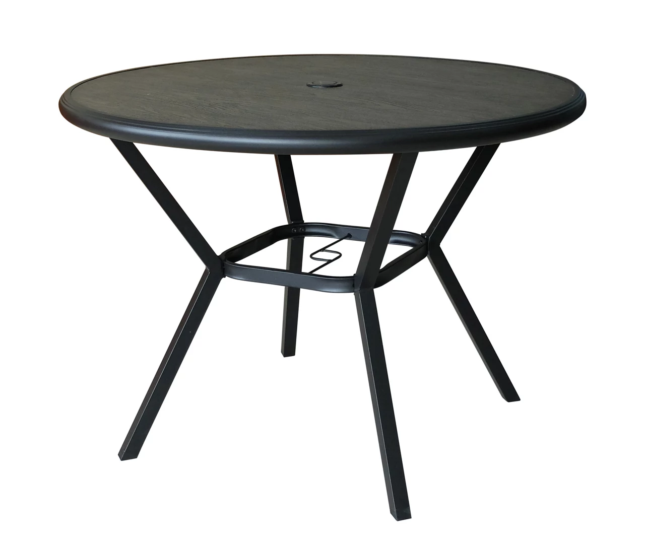 - Includes 4 outdoor dining chairs with seat cushions and round dining table