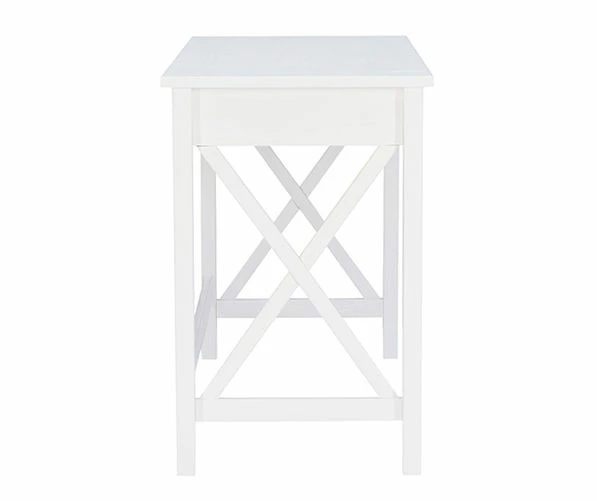 The versatile laptop desk makes good use of space with an ample work and display area. The X side design adds a classy touch to any living room, bedroom, office or entryway. The single, wide drawer provides hidden storage space for small items. An antique white finish allows this piece to easily complement any home décor.