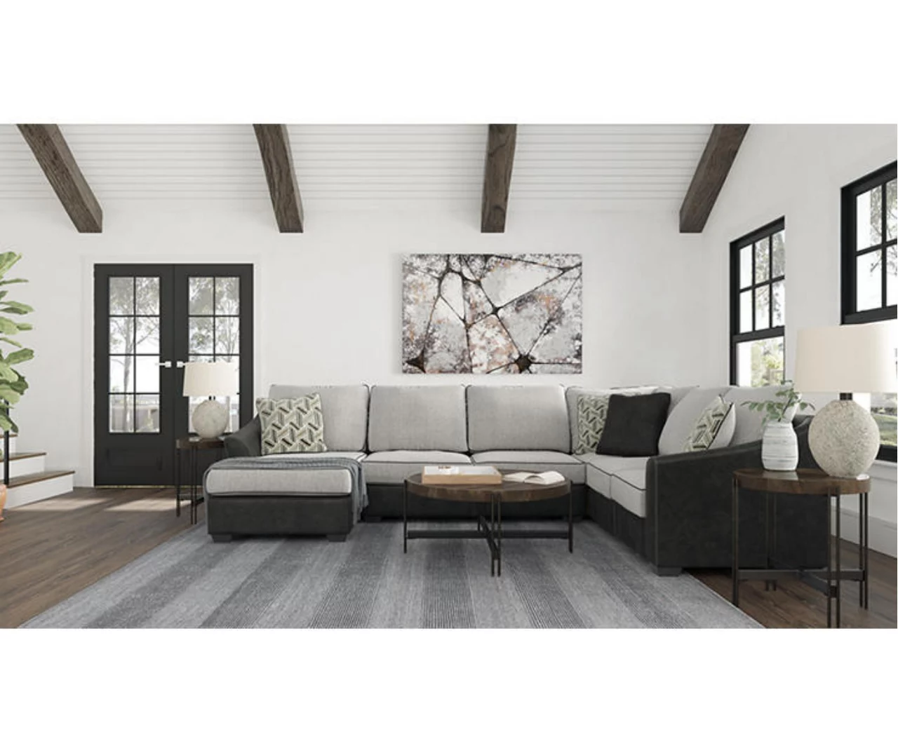 Double your luxury with this cool and contemporary sectional that distinguishes itself with dual fabric treatment. Wrapped in a feel-good herringbone weave upholstery outlined with pretty piping, the back and seat cushions provide the sumptuousness you crave. Beautified with contrast stitching, the faux leather on the frame adds a fashion-forward twist. Sloped flared armrests and abstract-patterned pillows perfect the aesthetic.