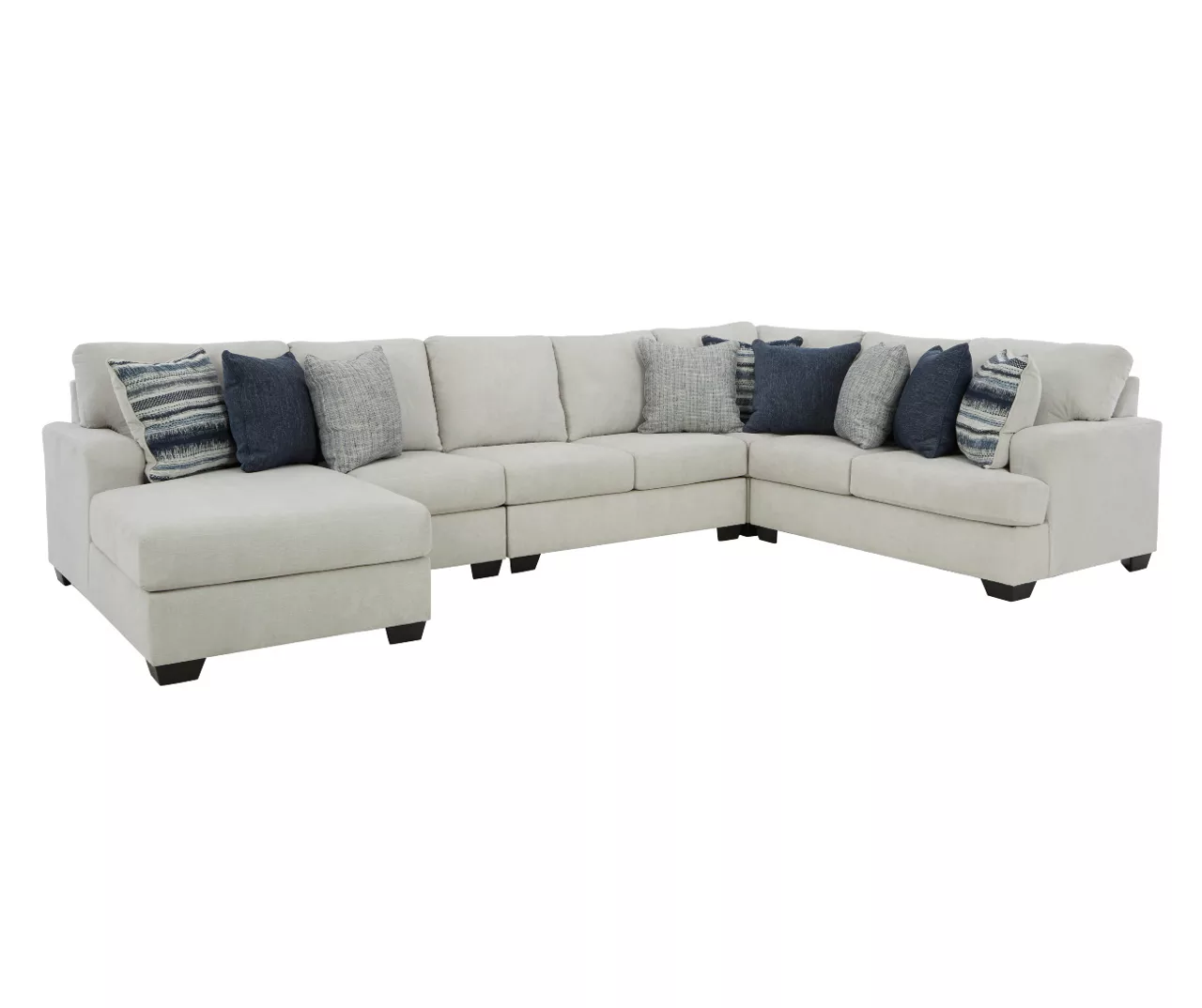- Stylish 5-piece sectional with left-arm-facing corner chaise, armless loveseat, armless chair, wedge and right-arm-facing loveseat