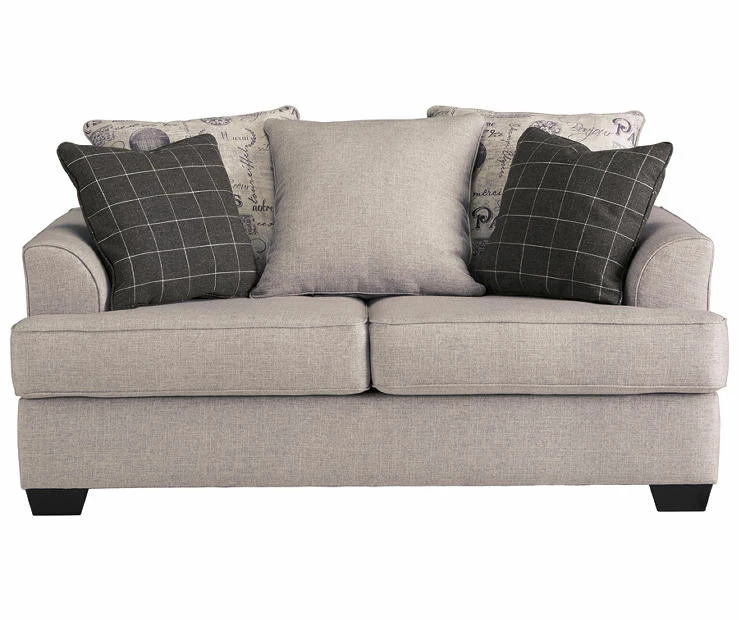 For the style enthusiast on a mission, the Velletri loveseat takes a unique approach to design. Two back cushions flaunt a vintage-inspired “Paris” script. Throw pillows continue the charm with gray-infused plaid patterns. Flared arms and neutral hue lend to transitional appeal. Covered in a luxurious linen-like chenille, its softness and luxurious comfort will keep you coming back.
