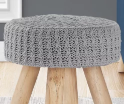 Simple in design but varied in function, this ottoman is a resourceful sidekick for a sofa or chair in a living room or bedroom. As a foot stool it’s a soft place to kick up your feet, as a makeshift table it’s a convenient surface to lay down a book or mobile device, and as a portable stool it’s an extra seat where and when you need it. The round padded seat offers a comfortable feel and is upholstered in a beige knit fabric for a distinctive look. Slanted, cylindrical wood legs and footrests provide support and have a natural color that coordinates with most décors.